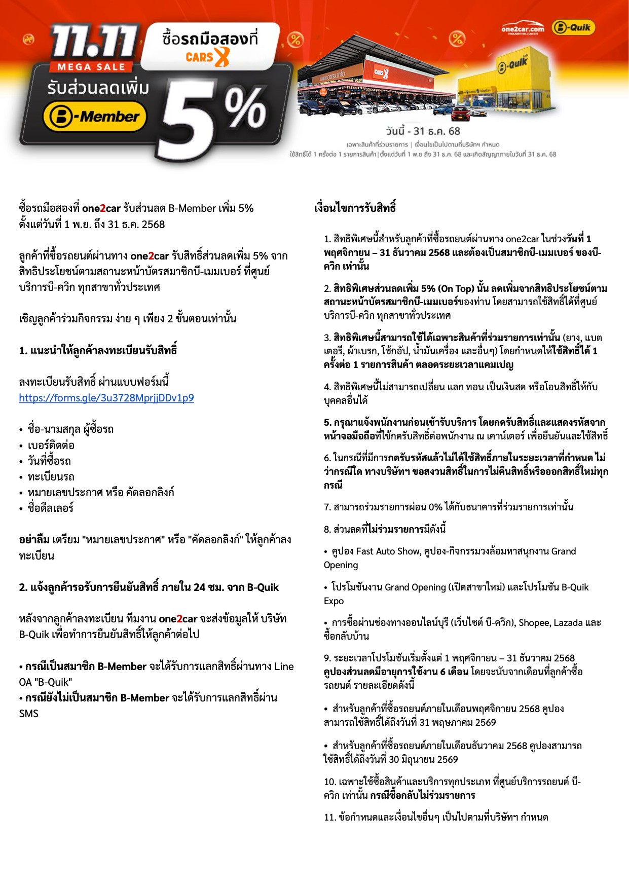 เงื่อนไขการรับสิทธิ์ B-Quik สำหรับลูกค้า one2car และ CARS X
