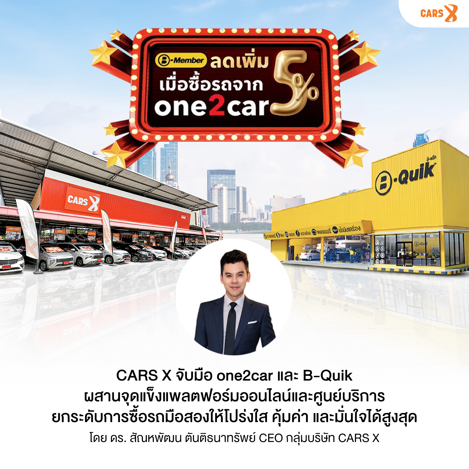 ดร. สัณหพัฒน ตันติธนาทรัพย์ ประธานเจ้าหน้าที่บริหาร (Chief Executive Officer) กลุ่มบริษัท CARS X ได้ออกมาเปิดเผยถึงความร่วมมือครั้งสำคัญระหว่าง CARS X, one2car และ B-Quik